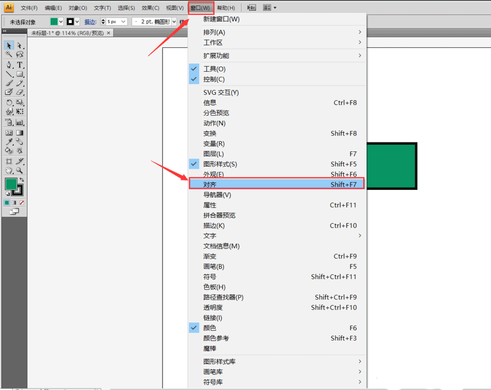 2、打开菜单中的“窗口”,选择“对齐”,点击即可打开对齐面板,如下图所示