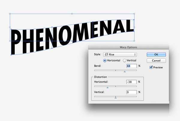 3、去对象>变换>扭曲,然后从下拉菜单中崛起的选项。改变弯曲约45%,调整水平失真约-40%。