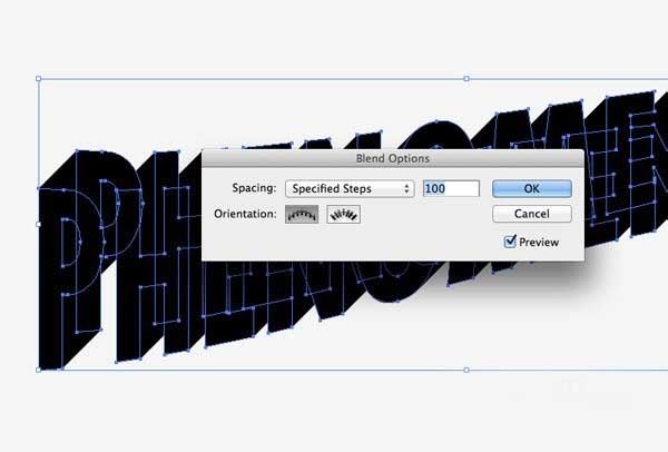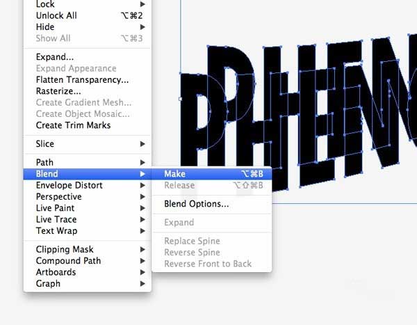 5、选择文本,然后按CMD + C复制,然后按CMD + B可粘贴在后面。移动文本这个副本斜向左然后选择两个对象去对象>混合>制作。