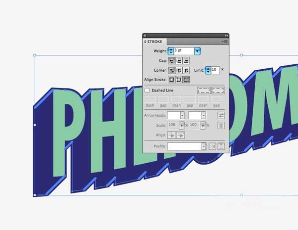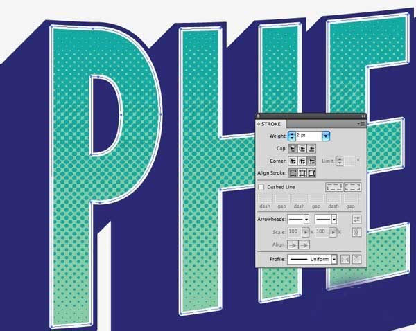 9、选择文本的混合部,并应用反衬色。使用相同的颜色,然后调整设置以3点左右对齐到外面添加描边。