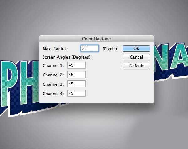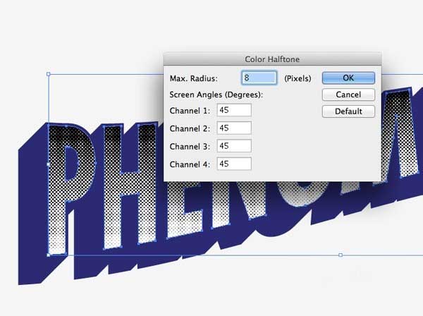 11、去影响>像素化>彩色半调,调整各种渠道的角度45°,这样他们都对齐,形成一个基本的半色调图案。根据文档的大小改变最大半径,但8个像素应该创造一个很好的大小圆点图案。