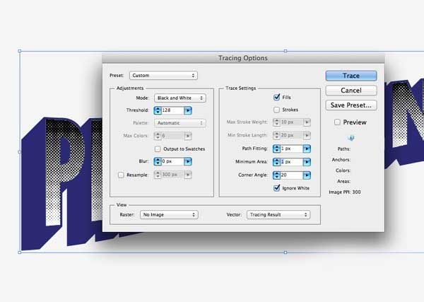 12、由Illustrator中创建半色调模式是基于不幸的是(这将是惊人的,如果它实际上是由它的矢量格式!)光栅。这意味着我们需要使用Live Trace工具向量化它。扩大网点影响下,对象>扩展外观,然后去到对象>实时跟踪>跟踪选项。改变路径,安装和最小面积设置为1px,然后选择忽略白。