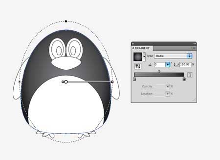 9、现在的基本结构和线条是完整的,我们可以开始使人物的生活与颜色。用灰色到黑色的渐变替换默认填充和笔划然后调整角度,以便它流径向从主体的中心。