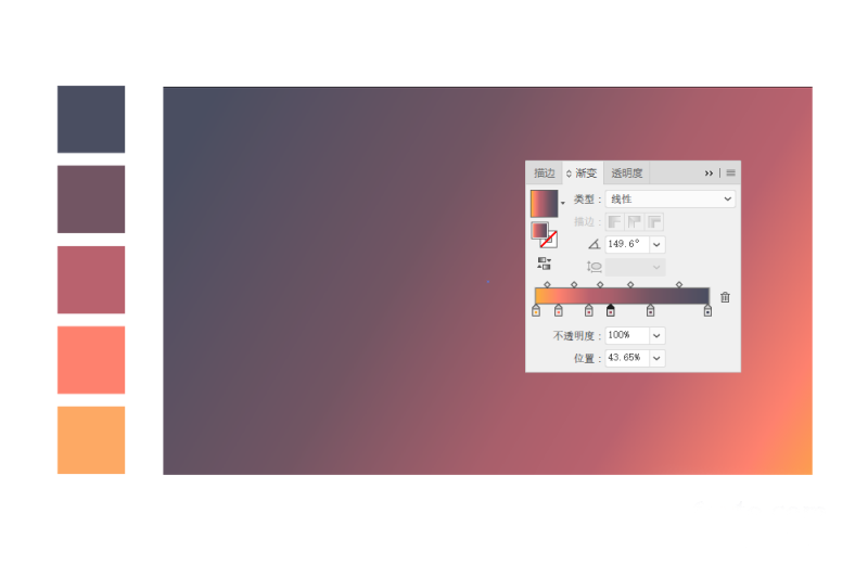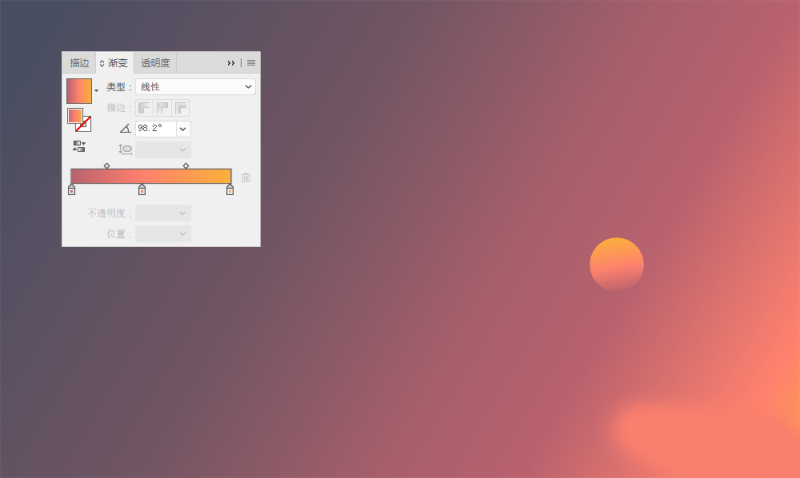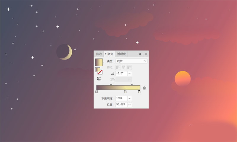 打开AI,创建一个1600960的文档。新建一个1600960的矩形作为背景,背景色填充为渐变。这个背景为天空,由于我们所要绘制的是一个从夜晚到黎明的有着时间变化的天空,因此,天空的渐变应该是由暗到明,注意天色过渡要自然。