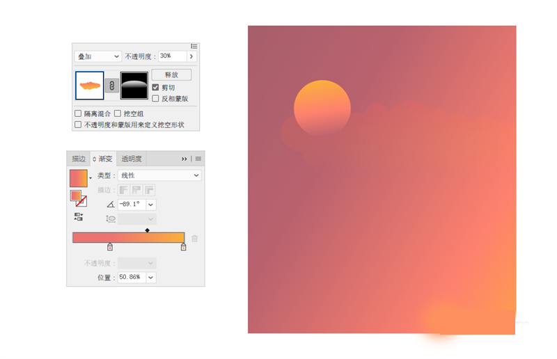 先为云朵填充渐变色,再降低透明度至30%,混合模式改为叠加。使其呈现出若隐若现的效果。