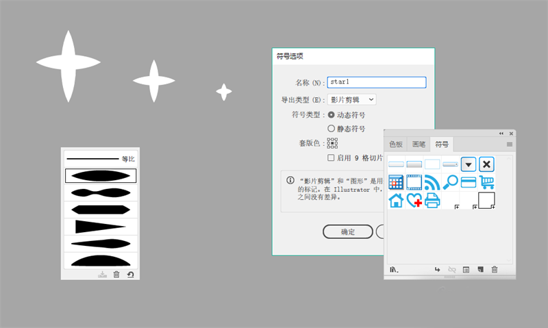 然后将这三个星形分别拖入到符号面板中,新建符号按照大小依次创建名称为star1(大)、star2(中)、star3(小)。