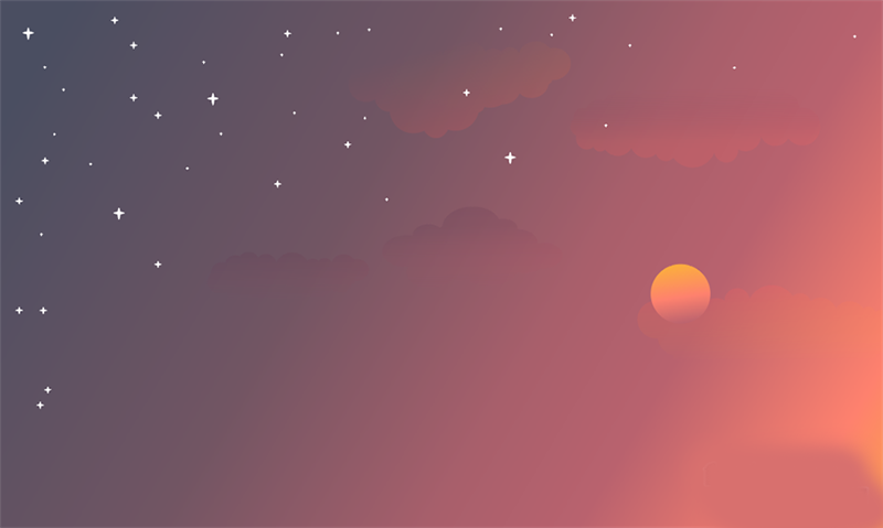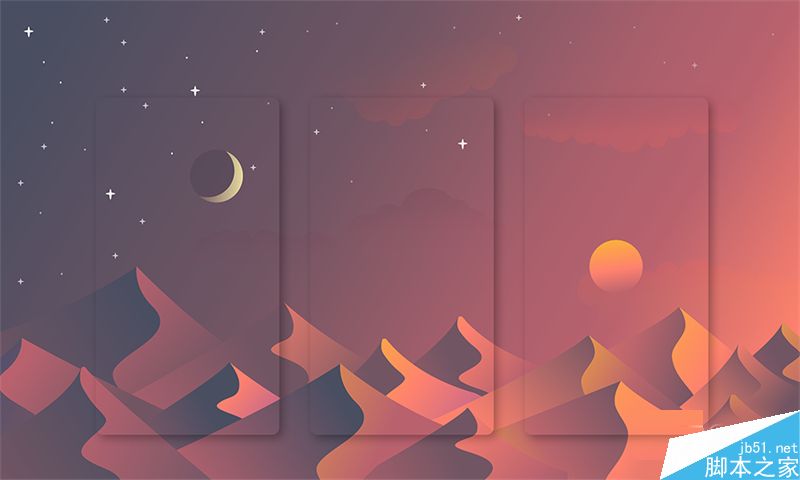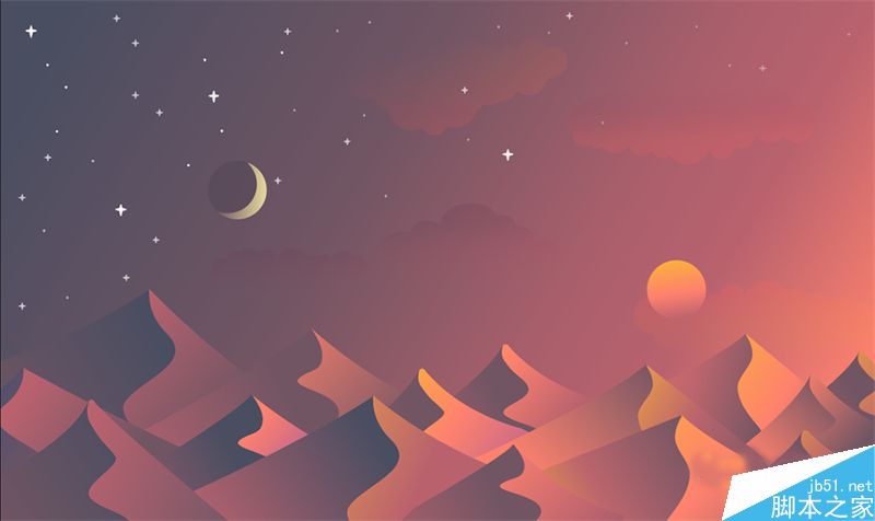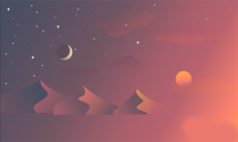 沙漠的美在于宁静,简洁蜿蜒、明暗起伏的沙丘,非常适合作为背景,从黑夜到黎明,体会日月变迁之感。今天我们要学的这款日月星辰背景插画的要点是:
