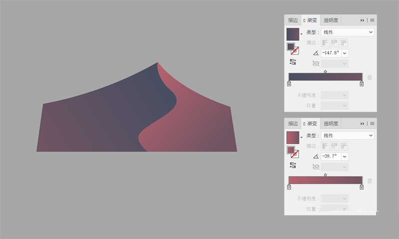 为两个形状填充为渐变色。单个沙丘的渐变色可以不需要太精准,沙丘群的色彩协调还需要整体来进行微调处理。毕竟色彩是非常微妙的。
