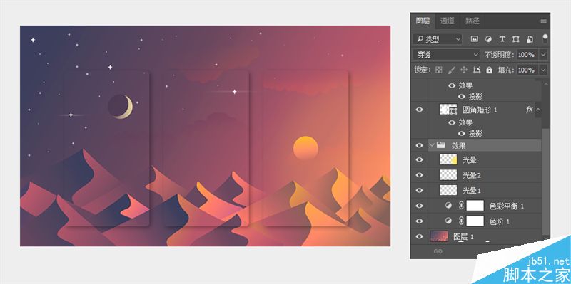 将AI文档在PS中打开,绘制3个圆角矩形代表三个手机屏幕。分别表达了从夜晚到黎明的三个瞬间。