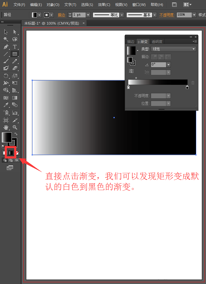 2、直接点击工具箱下方的渐变工具,我们可以发现矩形出现了系统默认的白色到黑色的渐变,并打开了渐变面板。