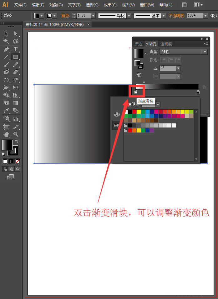 3、我们先来设置自己喜欢的渐变。在渐变面板中,双击渐变滑块,会弹出颜色面板,我们设置自己喜欢的渐变。