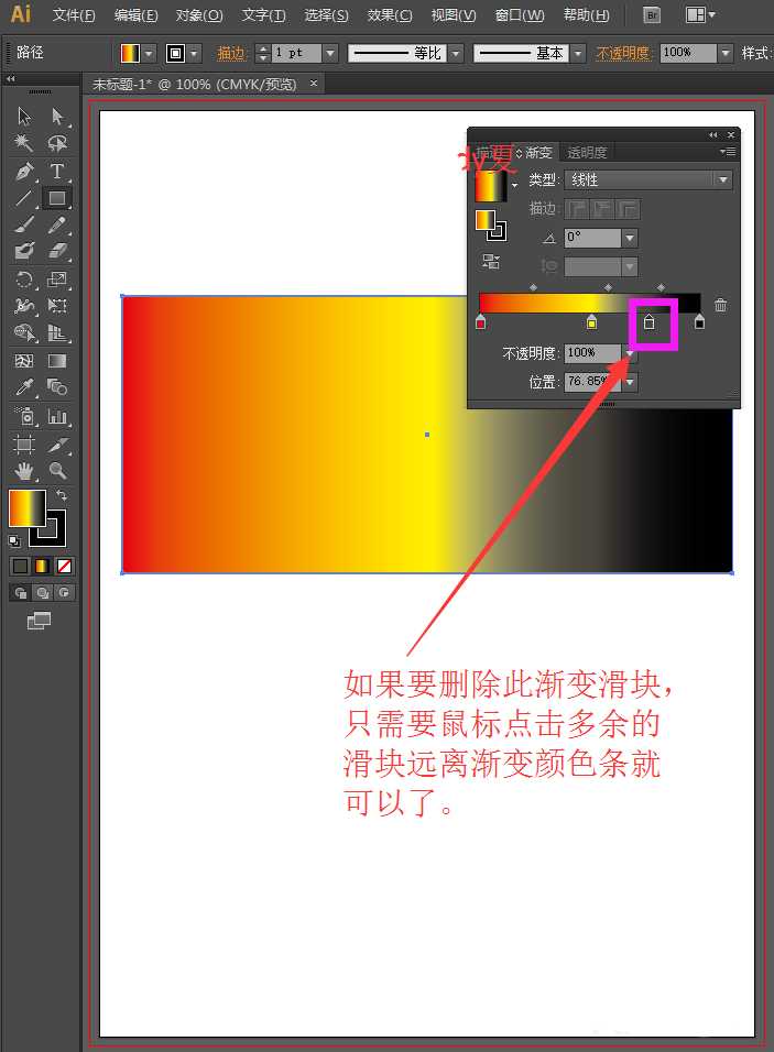 5、如果有多余的渐变滑块,我们需要删除的话,直接鼠标点击渐变滑块远离颜色条就可以删除多余的渐变滑块。