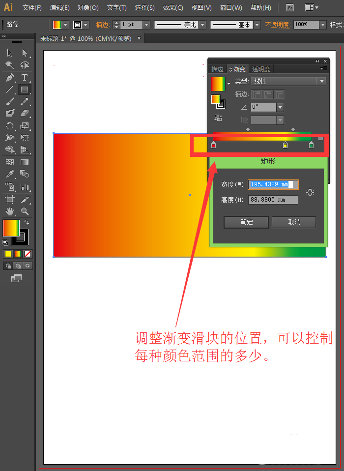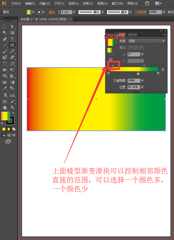 7、同样地,调整上面的棱型渐变滑块可以控制相邻两种颜色范围的多少,可以选择一个颜色多,一个颜色少。