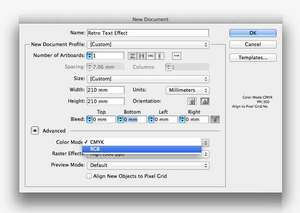 2、为了创建这个特定的效果,我们需要建立我们在RGB模式Illustrator的文件,利用鲜艳的色彩更广泛的频谱。在高级设置更改色彩模式为RGB。