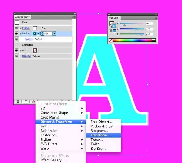 5、添加另一个行程,然后改变颜色为白色7pt。目前,这隐藏了绿松石行程,但是从外观面板中选择它,单击效果图标,然后选择变换。