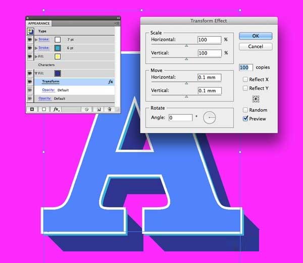 12、去扭曲和变换>变换下的效果菜单,并在右侧的副本框中输入0.1毫米在水平和垂直方向移动的选项,以及100。预览来看看它是如何创建一个复古风格的3D效果。