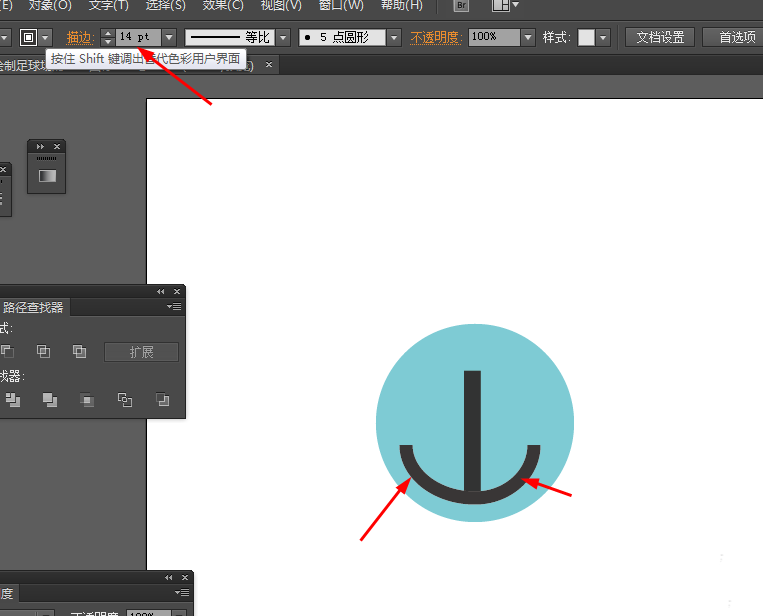 3、接着选择弧线工具,画两条弧线,描边改为14pt,如图所示
