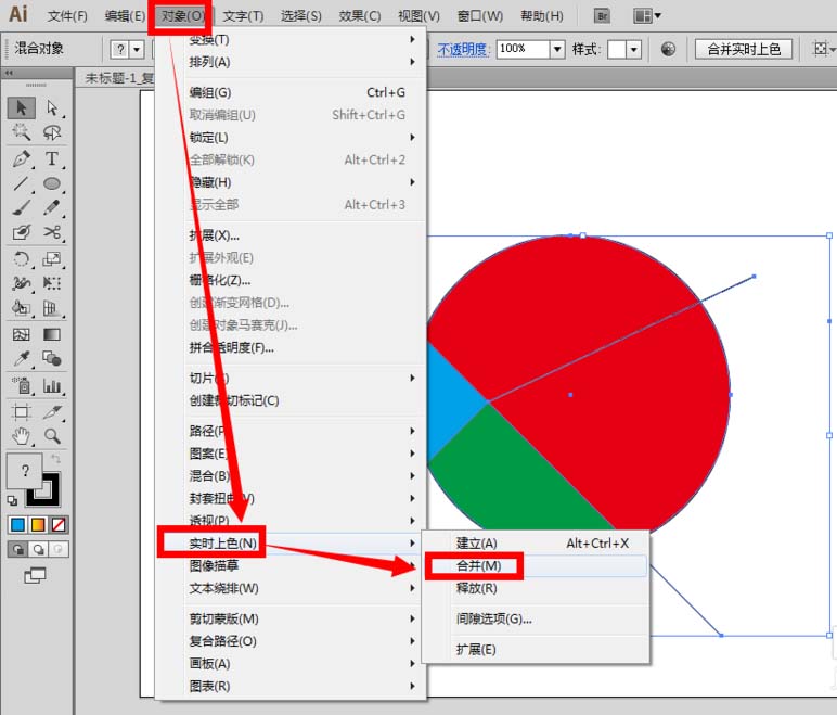 4、全部选中画布上的图形线条,点击菜单栏里的“对象”——“实时上色”——“合并”