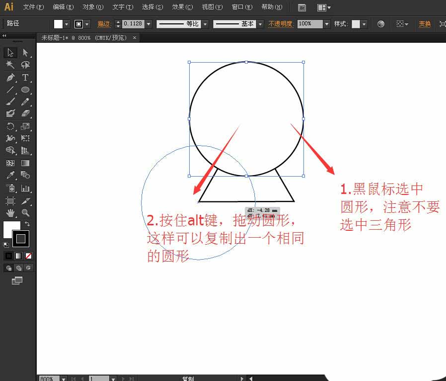 6、我们还需要再复制两个大小相同的圆:先用黑箭头选中圆形(注意不要选到三角),按住alt键后拖动圆,这样就复制了一个圆了。