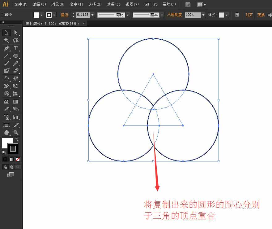 7、将复制出来的圆的圆心分别与三角形的顶点重合。