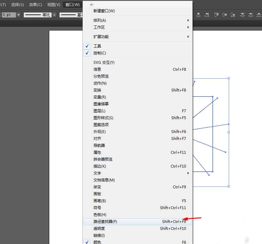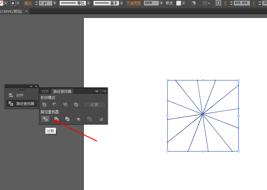 4、选中正方形和直线到窗口—路径查找器—点击分割,如图所示