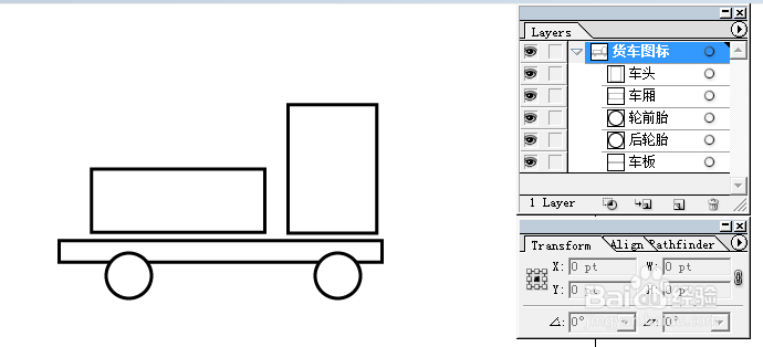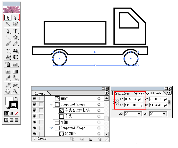 6、与车头切右上角的方法一样,选中前后轮胎以及“车板”【注意:车板图层一定要在前后轮胎下面】使用路径查找器(Pathfinder)工具,在图形模式(Shape Modes)中选择减去,这样轮胎在车身轮廓就出来了。