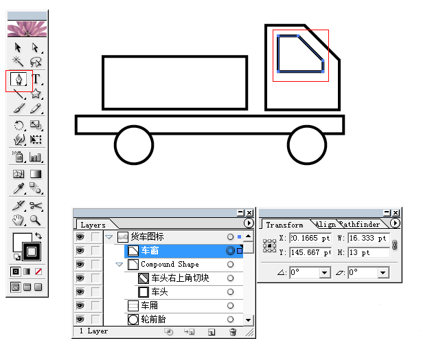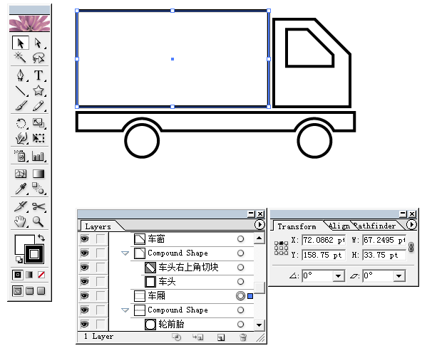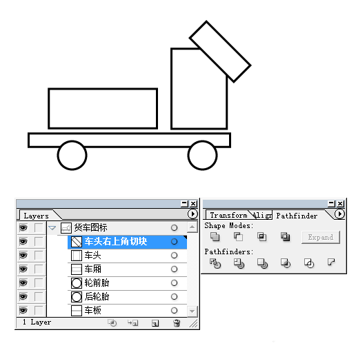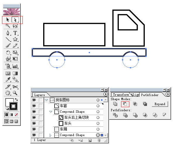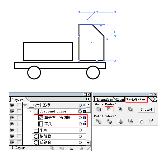 3、选中“车头右上角切块”,按住Shift,再选中“车头”。【注意:“车头”图层一定要在“车头右上角切块”下面】使用路径查找器(Pathfinder)工具,在图形模式(Shape Modes)中选择减去,这时,会自动将两个图层合并为一个复合路径(一个图层),“车头”上会去掉一个角。
