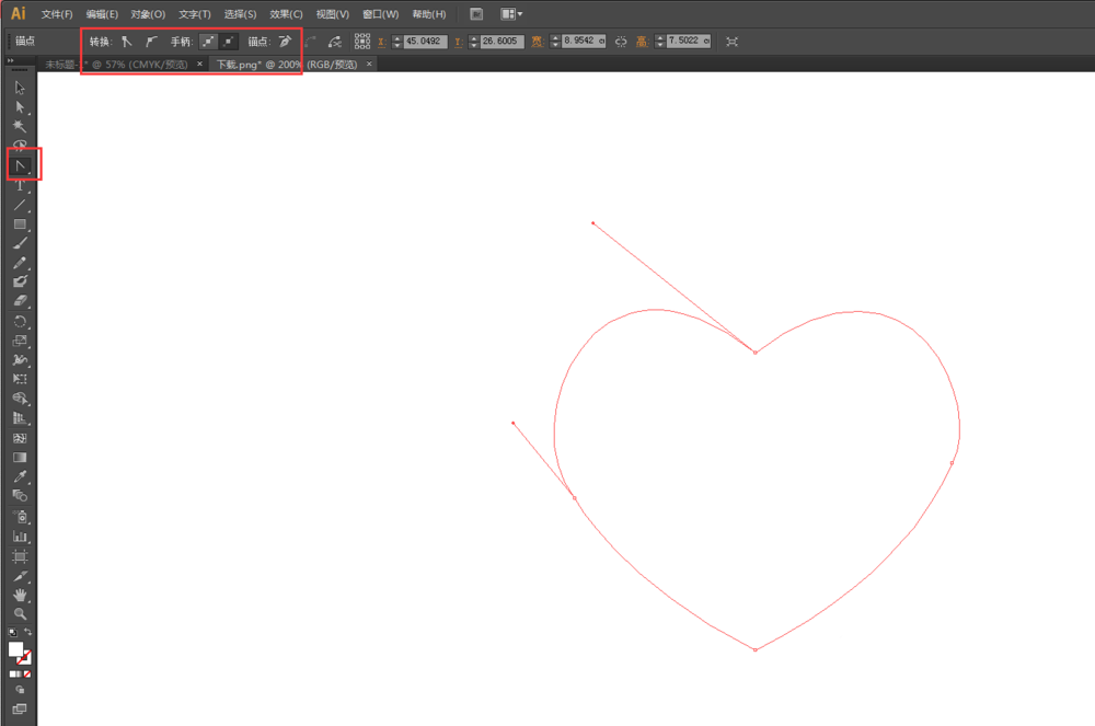 3、转换描点工具:我们刚才用钢笔工具制作了一四边形一样的图像,那如何才能制作出红心呢,我们还需要用到钢笔工具里面的转换描点工具,把四边形转换成曲线,然后一一描边做成像红心的形状。(如下图)