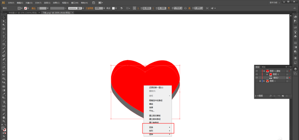 6、变换红心层次:点击灰色红心图层往红心图层上拖动,使灰色红心在红色红心下面。或者我们单击鼠标右键,弹出一个小窗口,点击排列。后移一层。(如下图)