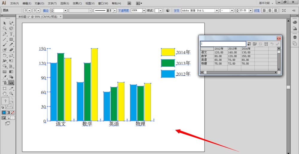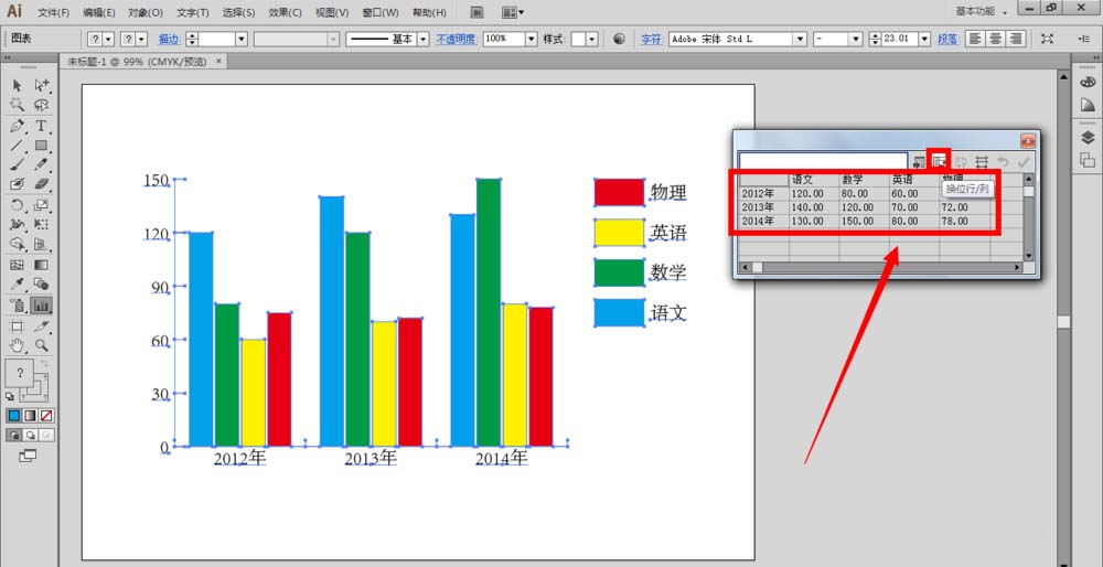 1、以前创建的图表,原来导入的数据如图所示,年份同一列,科目在一行,在数据面板的上方有个“换位行/列”按钮,点击它