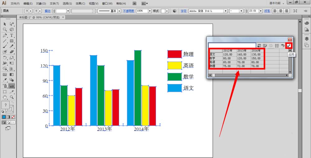 2、点击以后,从数据面板上可以看到数据摆放位置变了,年份在一行,科目在一列了,我们继续点击右上角的应用按钮