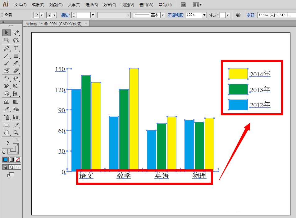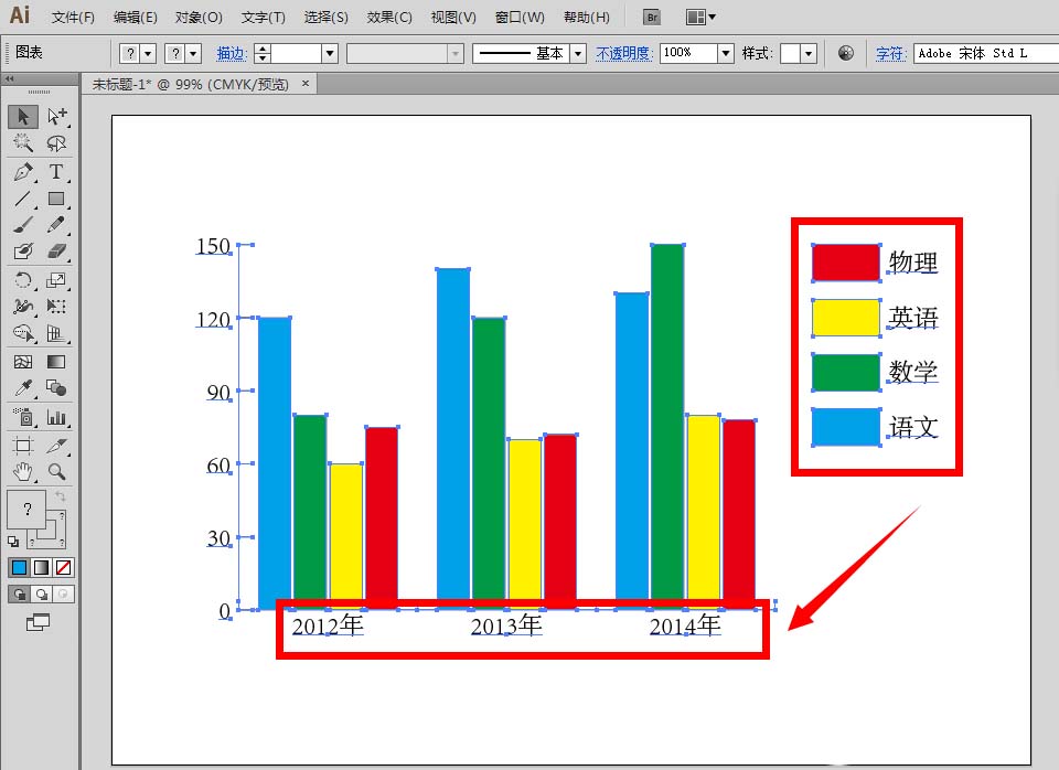 4、把前后的两个图表放在一起进行对比,就可以看到,原来的是每年每个科目之间的对比图表;而点击“换位行/列”以后制作成的图表,变成了每个科目在每一年自己的对比了。