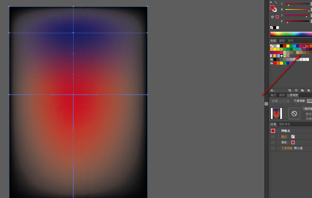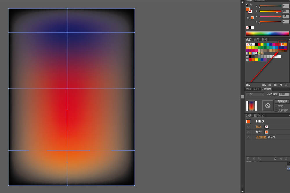 4、再在中间用网格工具增加个节点,填充为深红色。