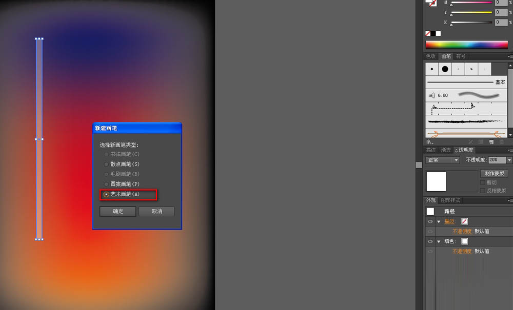 10、我们将矩形拖动到画笔面板上,弹出对话框,让你选择新建画笔的种类,我们选择“艺术画笔”。点确定。
