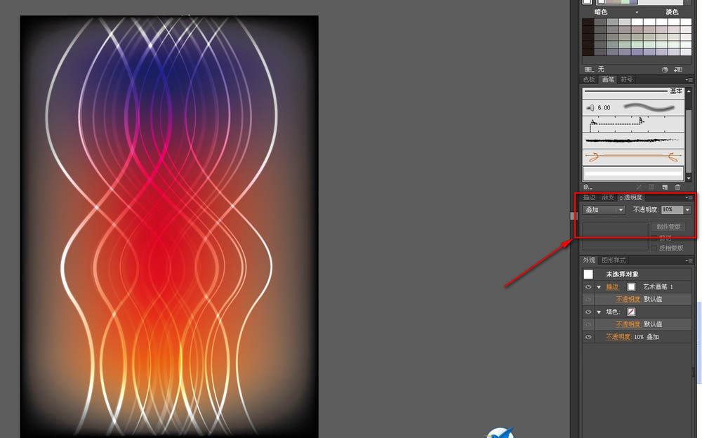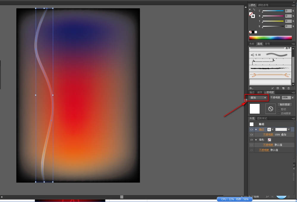 14、继续选中刚画的曲线,在透明面板上将模式改为“叠加”。