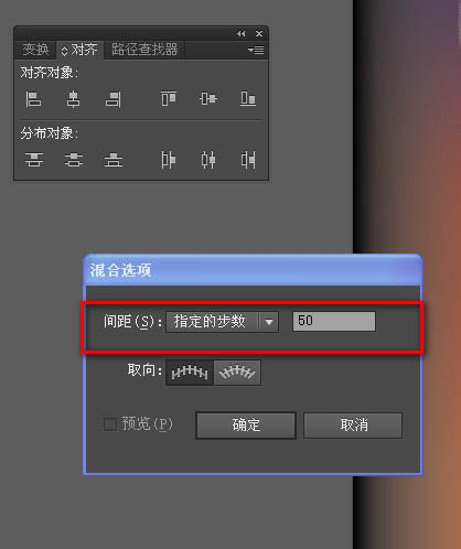 9、我们在弹出的面板中,间矩选择“指定的步数”数值为50.点确定。并在菜单上选择,对象-混合-建立。