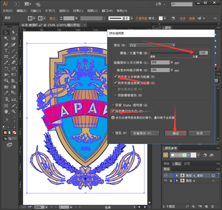 2、选中上层文件,点对象拼合透明度。如图,点确定。