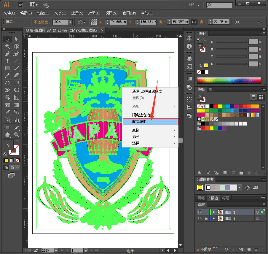 3、在对象上右键-取消编组