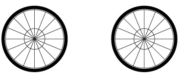 3、设置填充为无色,描边为黑色,描边粗细为10pt,然后选择椭圆工具,将光标放在刚才创建的图形的圆心处,按住Alt+Shift组合键,由中心点向外画出正圆;选择选取工具,将车轮全部选中并按Ctrl+G组合键进行群组,就完成了车轮的制作。如图: