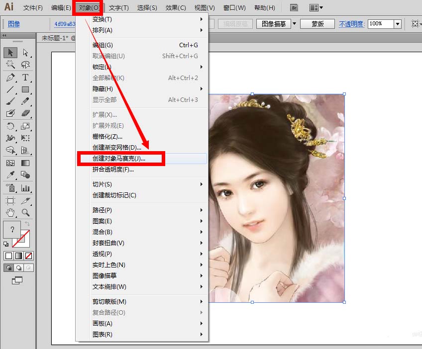 1、选中画布上的图片,点击菜单栏的“对象”——“创建对象马赛克”