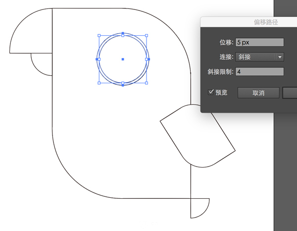 这时小鸟的轮廓已经大致出来了~再来绘制小鸟的眼睛。利用圆形工具(L)画一个圆。选中该圆选择"对象-路径-偏移路径",位移填5px。可以得到一个外圆。