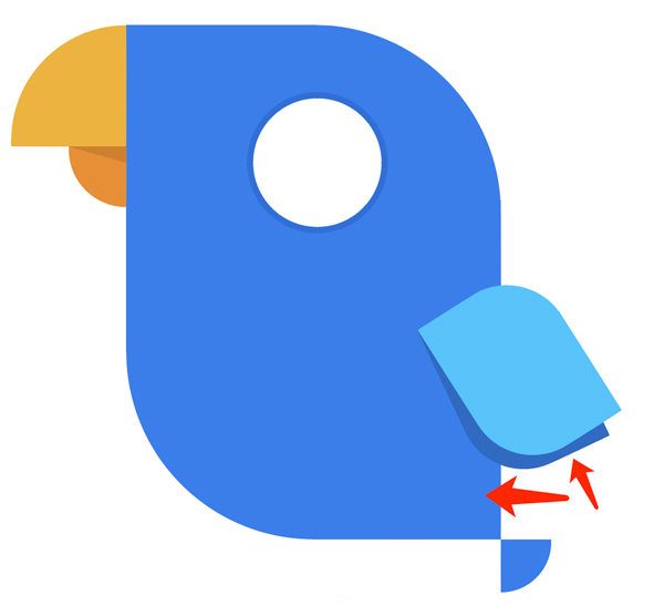 2)翅膀的阴影。选中翅膀crtl+c,ctrl+f 复制一个翅膀在原处,填充深一点的蓝色,并让其在现有翅膀的下方,"对象-排列-后移一层"。并往左下方旋转一些~