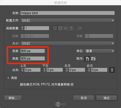 打开AI,新建一个800像素x800像素的文档。设置如图: