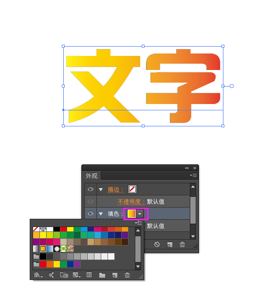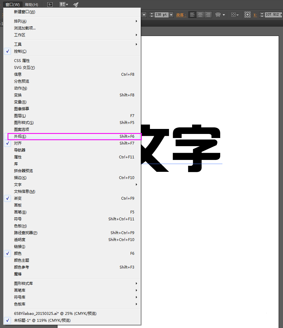 2、接着,就是为文字制作渐变效果了。使用选择工具选中文字,鼠标点击菜单栏里的“窗口”——“外观”