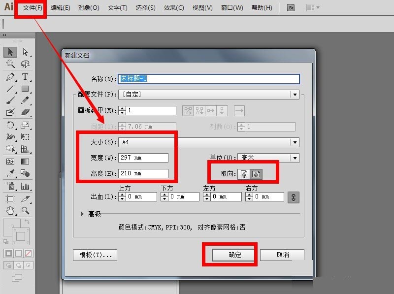 1、打开ai软件,点击文件——新建,先设置自己的画布的名称、大小,方向,然后点击确定