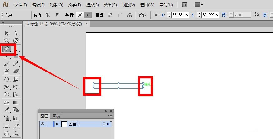 3、选择钢笔工具,在画布上任意的一个位置先单击,然后出来一个点,接着继续再另一头单击,我们就可以绘制出一条直线了~