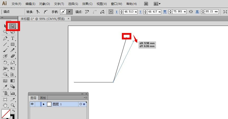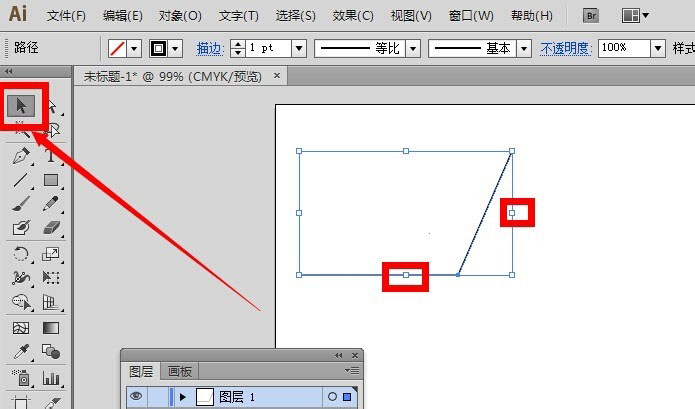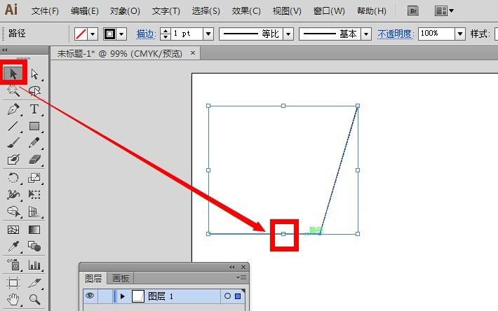 7、如果要改变倾斜角度大小,则要使用“直接选择工具”,点击下图形,出现的节点,直接用鼠标拉即可。往下拉上面的点,可得到倾斜角度变大: