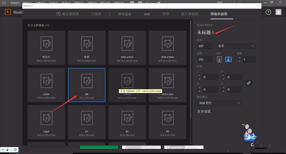 1、首先,我们开启Adobe illustrator(AI)程序,进入到起始页面,点击新建或者使用快捷键“Ctrl+N”,进行画布的新建,在illustrator的系统模版中,选中合适大小的画布后,点击“创建”即可。