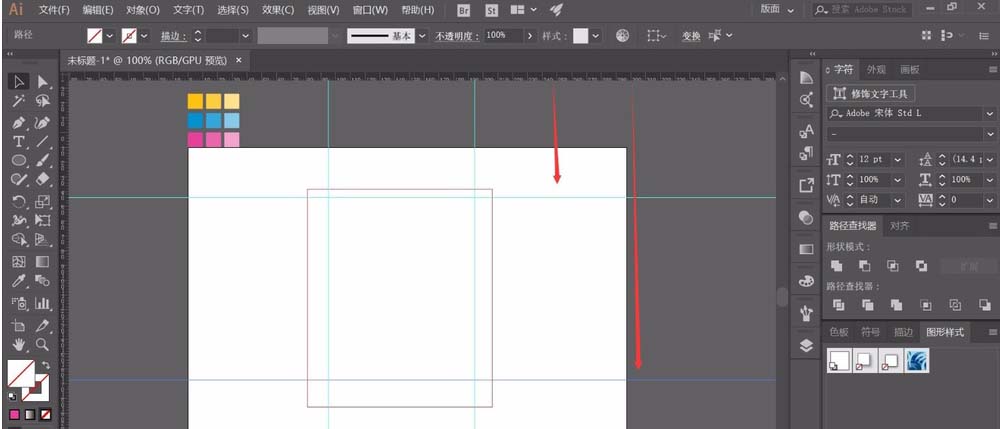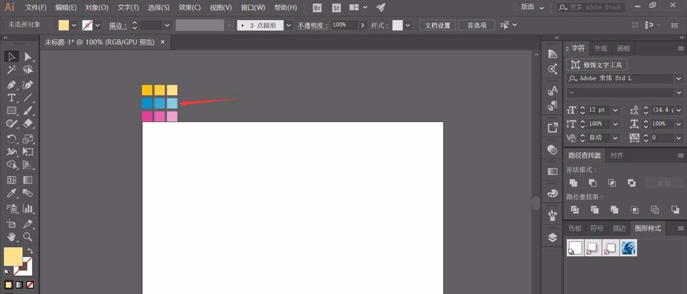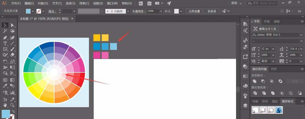 3、使用AI的“吸管工具”(快捷键-I),在色环上吸取我们需要的颜色,并使用提取的颜色,绘制出10*10的小方块,放置在画布旁边,即可完成配色方案的放置。