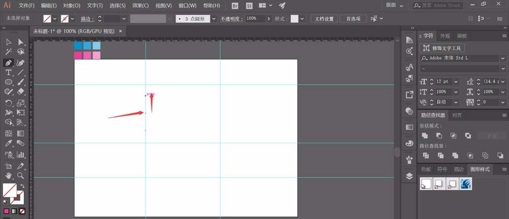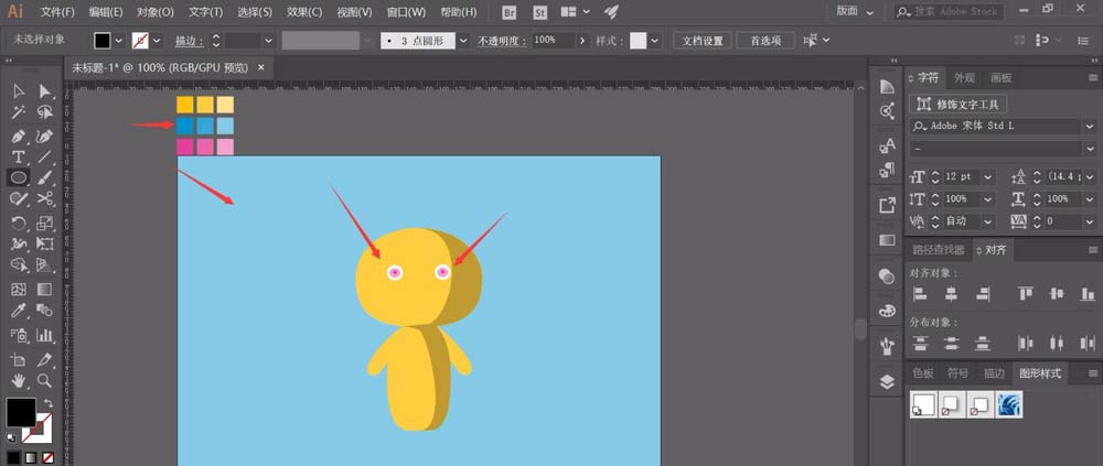 2、在进行卡通人物绘制前,我们最好在AI上放置好配色方案,在进行创作时,最好将颜色控制在三个左右,颜色较多会导致很难搭配,从而影响后期的视觉效果。